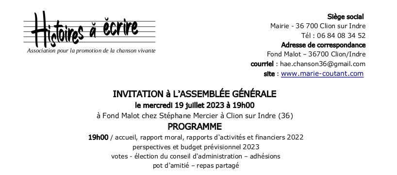 Confirmez votre venue à cette AG par mail. Si souhaitez adhérer à l’association pour l’année 2023 vous pouvez le faire en envoyant un mail qui précise l’objet « Adhésion HaE 2023 » à hae.chanson36@gmail.com. Vous pouvez envoyer votre adhésion par virement (RIB en cliquant ici). Merci d’avance pour votre soutien