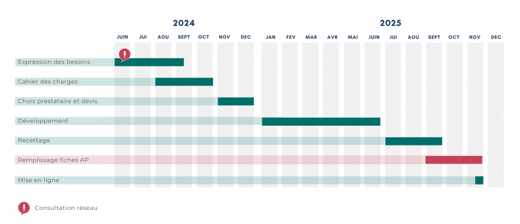 Longtemps attendue, la refonte de notre outil site web est une des actions fortes du projet Destinations Digitales, et un beau défi pour l’équipe de gestion. Une mise à jour de la partie publique avait été faite en 2021, mais restait insuffisante. Voici les étapes de construction pour ce nouveau site (cliquez pour agrandir) :