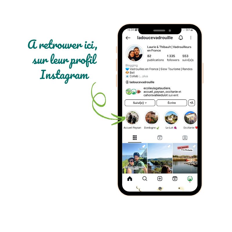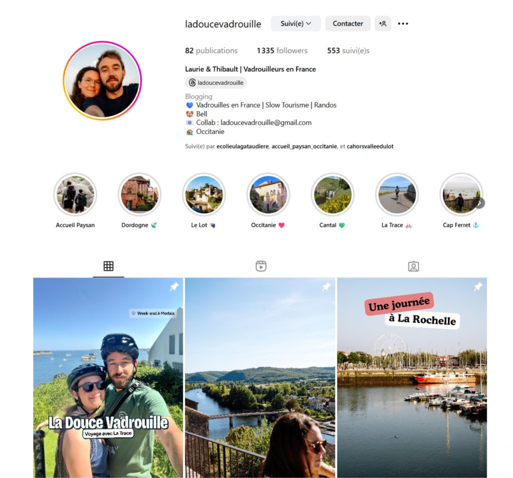 Laurie et Thibault forment un jeune couple de vadrouilleurs, qui partagent leurs découvertes du territoire français en slow tourisme via leur compte @ladoucevadrouille, suivi par 1335 personnes. En lancement, ils sont certes moins suivis que Camille mais leur communauté est fidèle et bien engagée sur leurs contenus. C’était un choix stratégique de travailler avec deux profils différents, l’un bien développé et l’autre plus restreint.