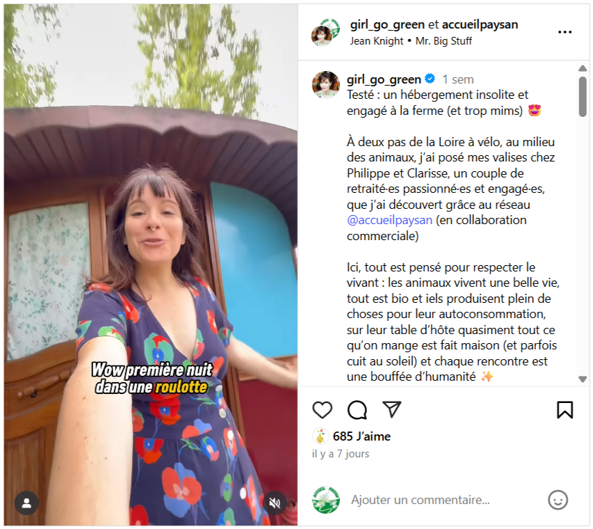 En ce début de saison, nous avons réalisé deux des quatre actions de promotion prévues avec des créateurs de contenus. Deux autres actions vont être menées entre septembre et octobre, afin de valoriser aussi les saisons automne/hiver à Accueil Paysan.