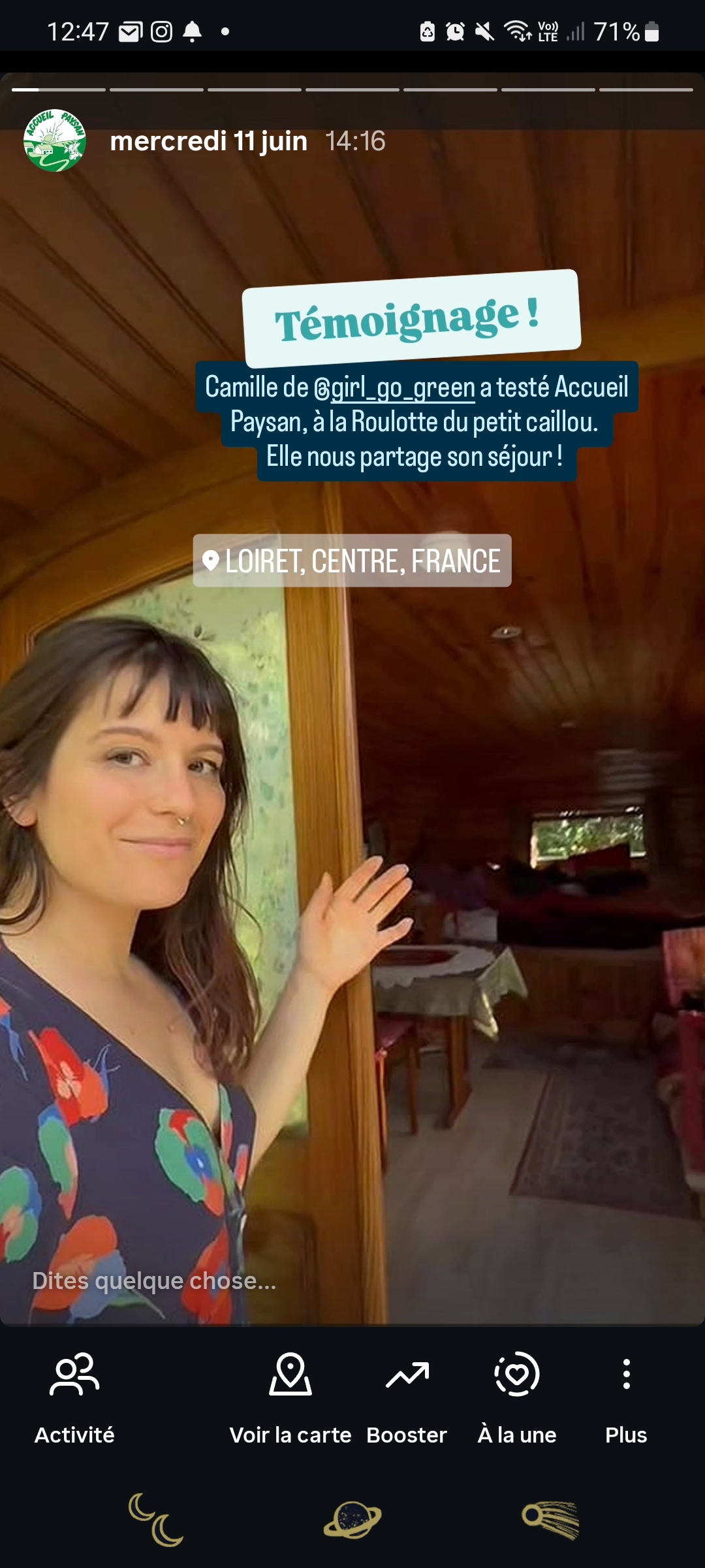 Un Reel (vidéo de 1 min qui reste ensuite accessible sur le profil, c’est le contenu le plus engageant d’Instagram) co-publié avec Accueil paysan, qui reste disponible sur les deux comptes.