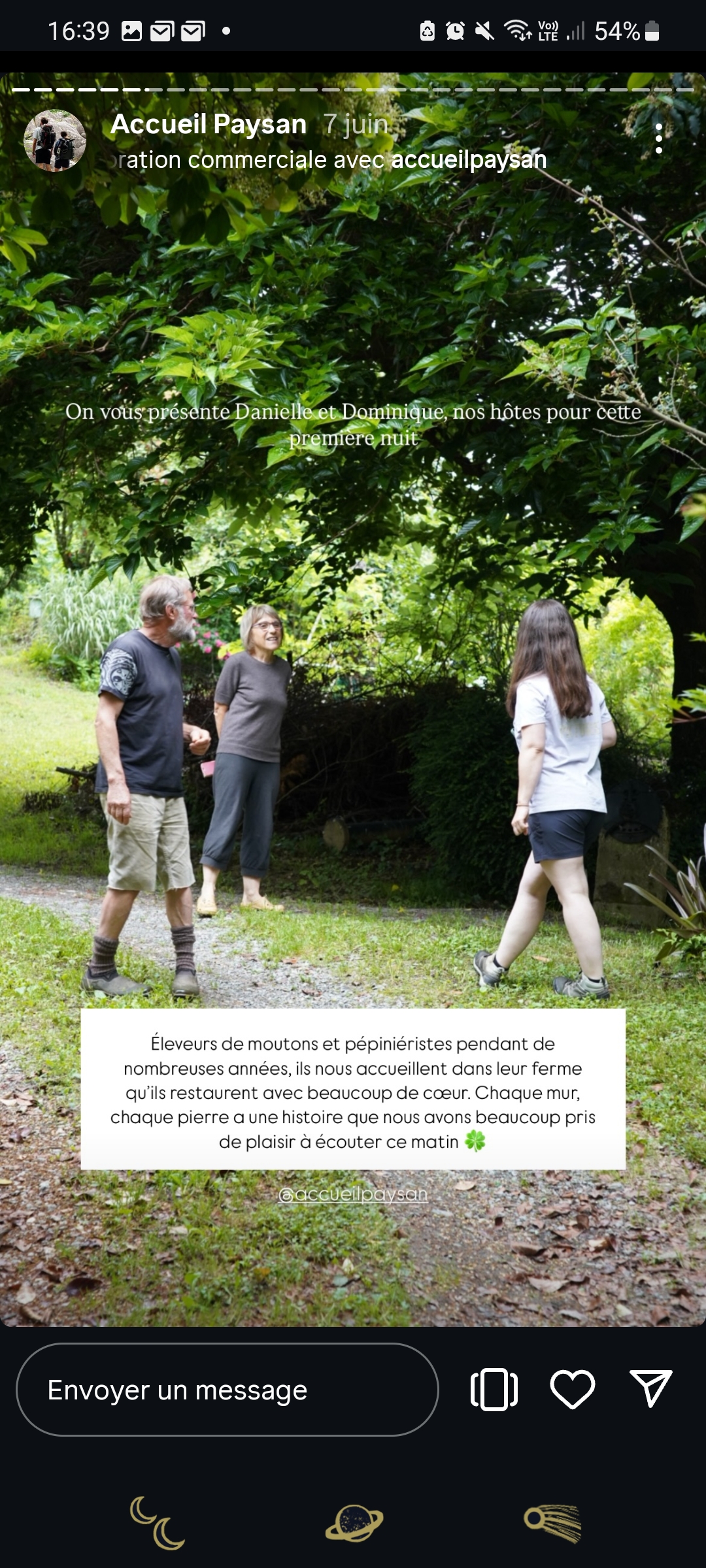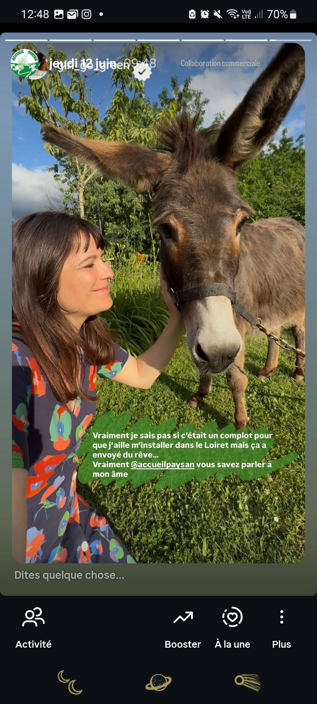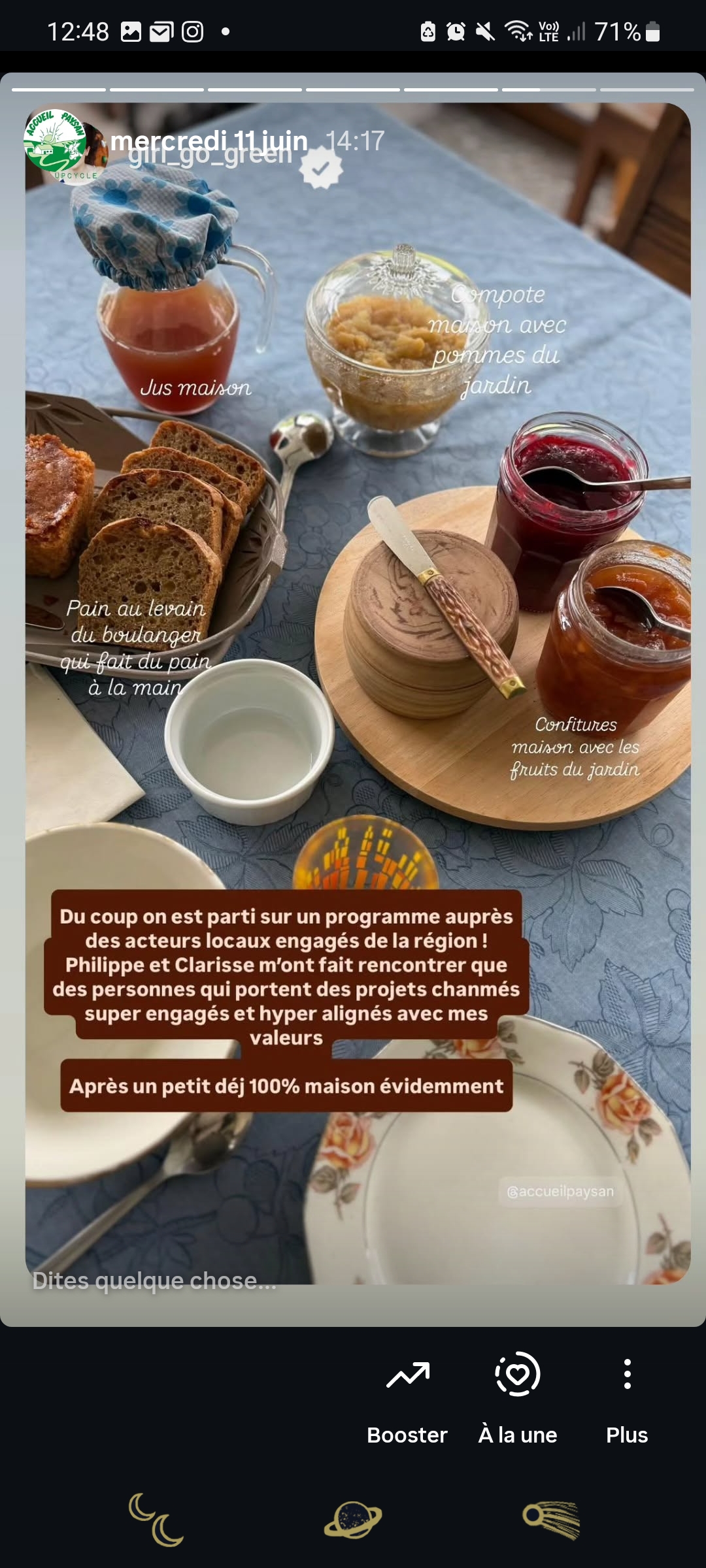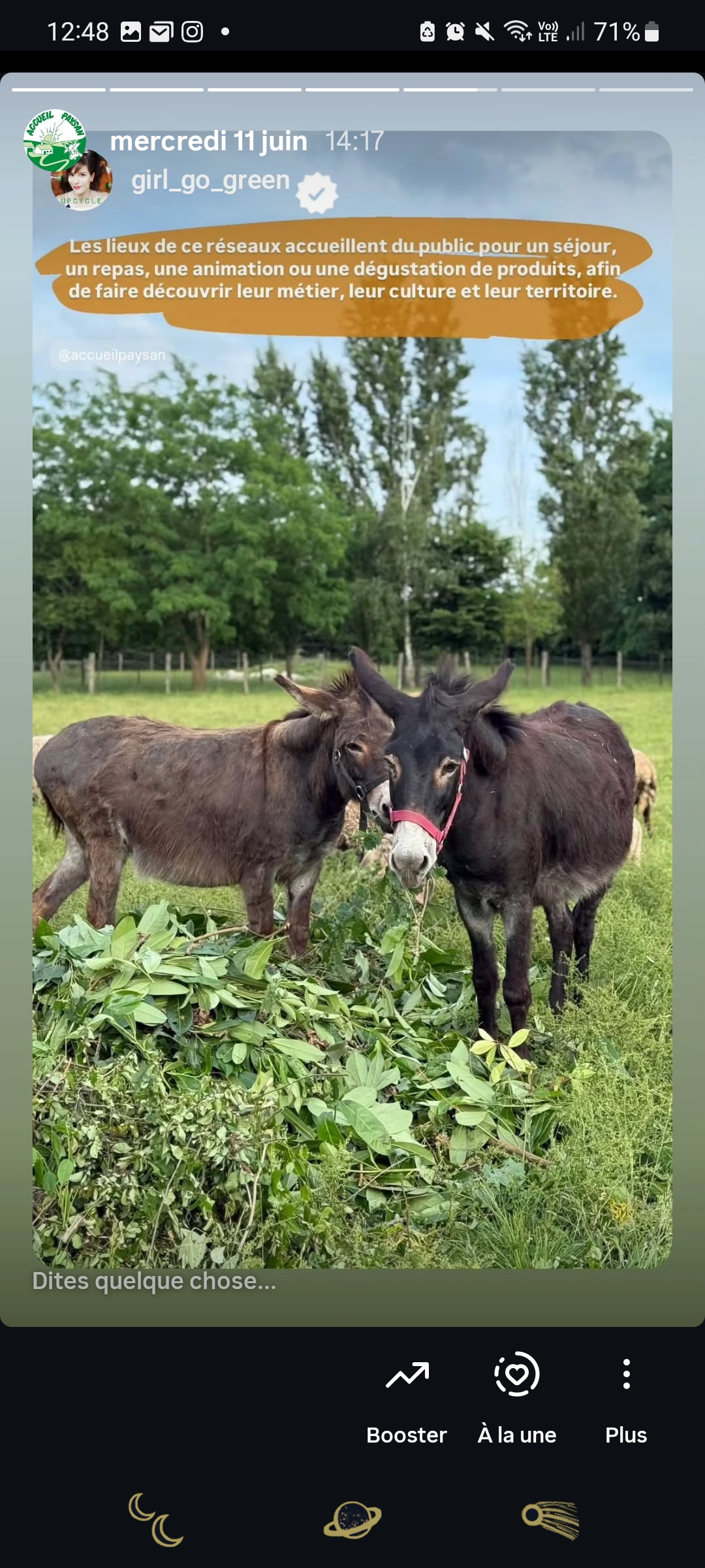Beaucoup de Stories, (images ou vidéos qui restent disponibles 24h pour les abonnés du compte) qui ont été repartagées sur le compte d’Accueil Paysan, et qu’ils ont laissé à disposition dans leurs contenus à la une, sur leur profil.