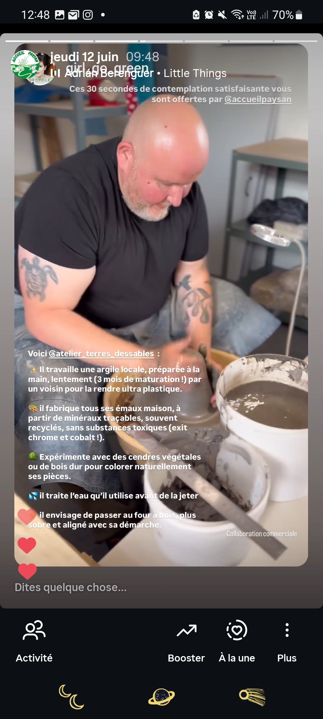 Deux Reels (vidéos de 1 min, c’est le contenu le plus engageant d’Instagram) co-publiées avec Accueil paysan, qui resteront disponible sur les deux comptes. Les vidéos sont visibles ici mais pas encore publiées, elles le seront très prochainement.