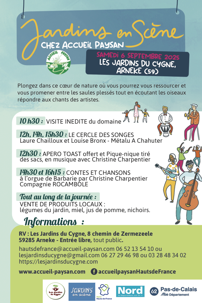Renseignements : lesjardinsducygne@gmail.com 06 27 29 46 98, 03 28 48 34 02 https://lesjardinsducygne.com