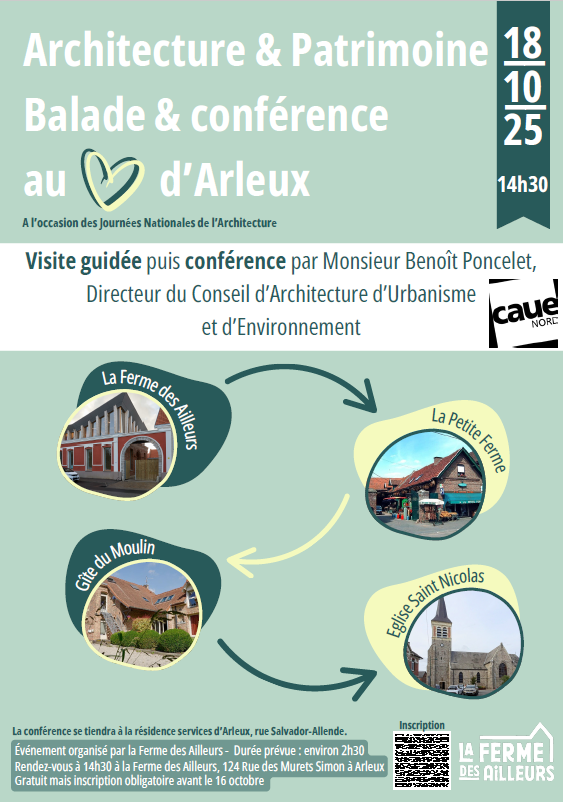 Au programme : une balade guidée à travers plusieurs lieux emblématiques d’Arleux (La Ferme des Ailleurs, La Petite Ferme, le Gîte du Moulin et l’Église Saint-Nicolas), suivie d’une conférence animée par Monsieur Benoît Poncelet, Directeur du CAUE Nord.