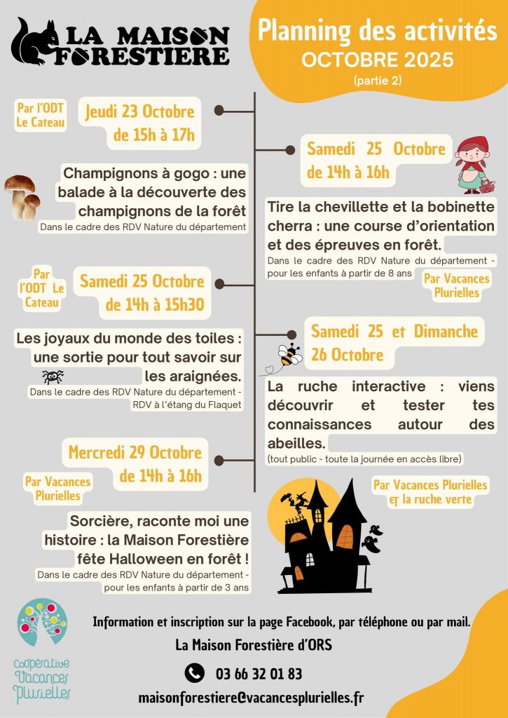 👉 Toujours dans le Cambrésis, à La Maison Forestière à Ors, c’est aussi Halloween que l’on fête ! Dans la forêt du Bois l’Evêque avec la Sorcière Mary le mercredi 29 Octobre – de 14h à 16h : « Sorcière, raconte moi une histoire à la Maison Forestière » Une animation tout en douceur à destination des enfants à partir de 3 ans. Proposée par Vacances Plurielles dans le cadre des RDV Nature du département du Nord. Réservation au 03 66 32 01 83 🍁