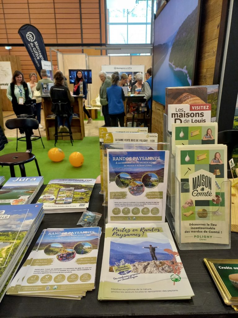 Du 20 au 22 mars, les adhérent·es du Jura sont allés faire la promotion des Randos Paysannes, dont ils proposent deux parcours « événement » durant l’année, en juin et en septembre. Sur leur stand, le flyer Randos Paysannes, l’un des supports clé pour promouvoir les Randos auprès du public.