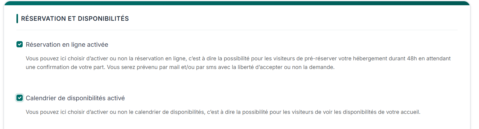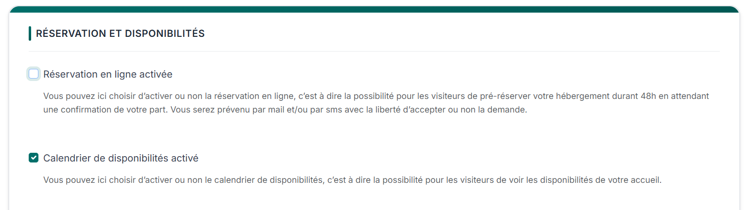 ✅Pour activer la réservation en ligne, vous devez cocher les 2 cases « Réservation en ligne activée » et « Calendrier des disponibilités activé«