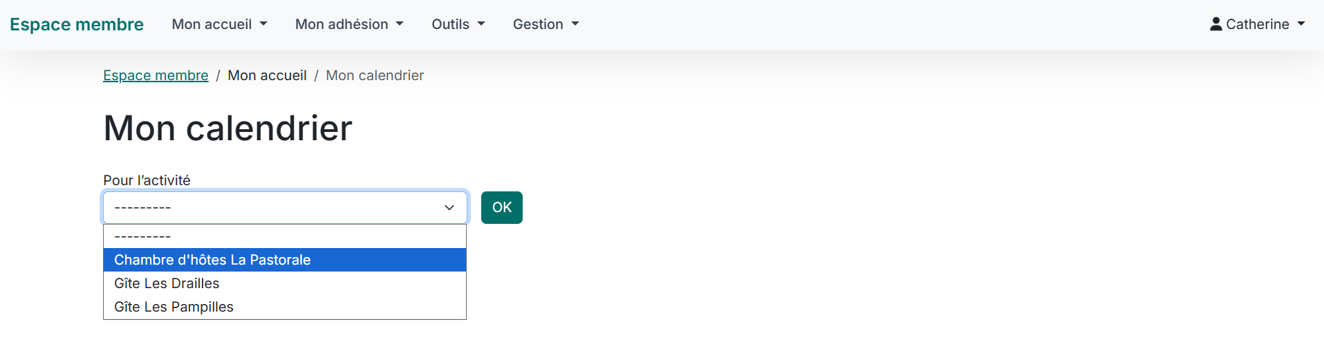 ✅Une fois sur la page Mon calendrier, sélectionnez l’hébergement pour lequel vous voulez remplir le calendrier dans la liste déroulante et cliquez sur le bouton OK.