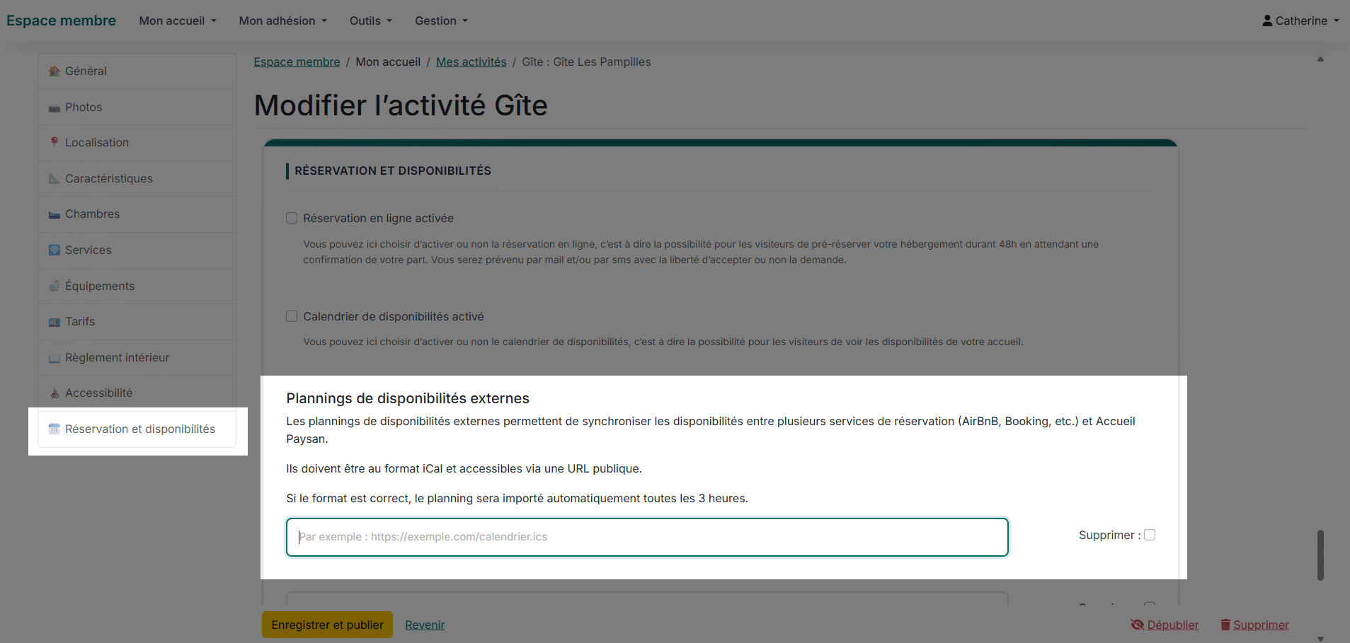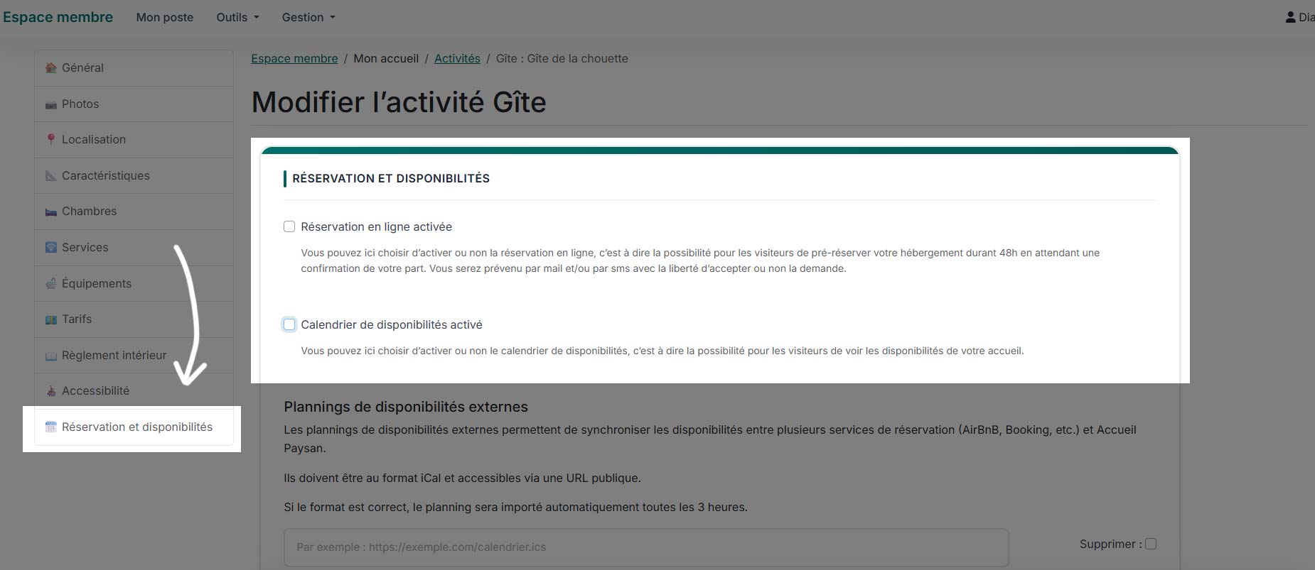 ✅Dans votre fiche hébergement, rendez-vous dans la rubrique 🗓️Réservation et disponibilités via le menu de gauche.