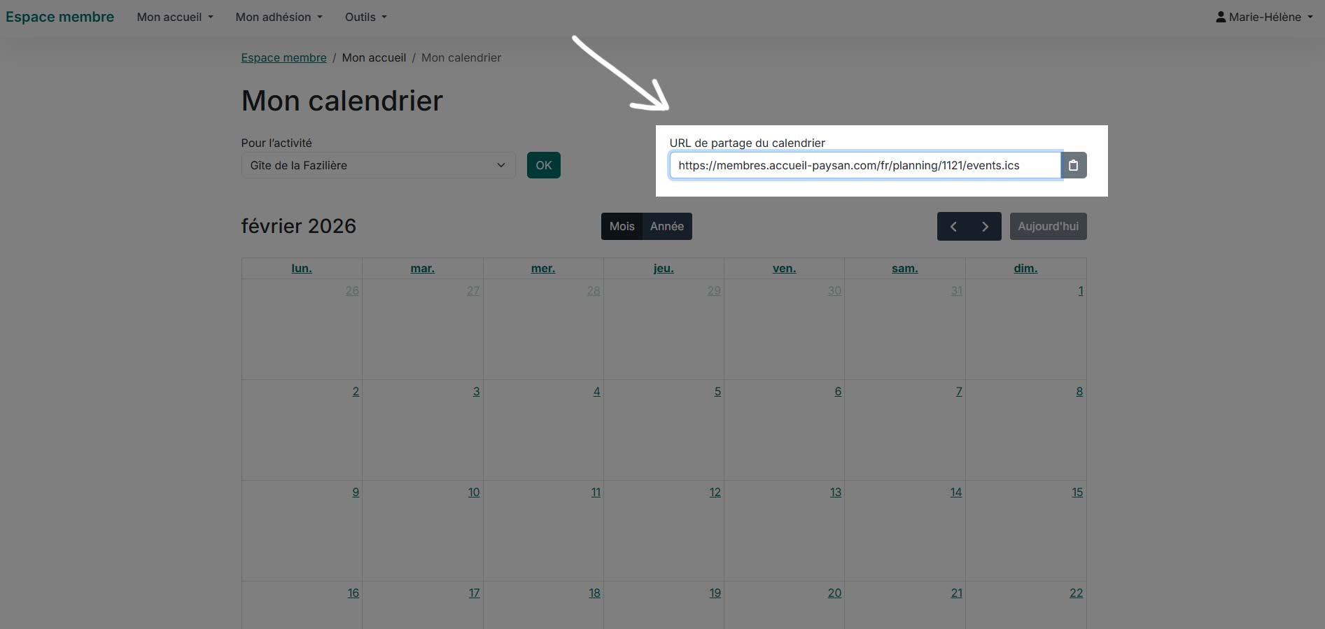✅Le lien de synchronisation iCal de votre calendrier Accueil Paysan s’affiche à droite. Vous pouvez le copier pour le coller ensuite dans l’espace dédié de votre système de calendrier externe.