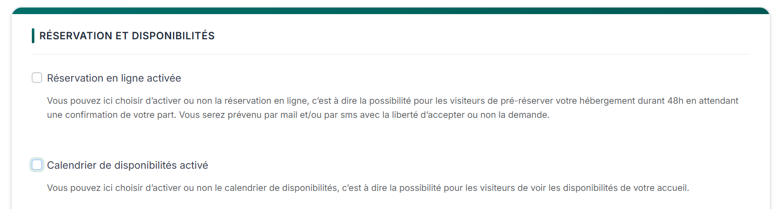 ✅Si vous préférez ne pas activer ni la réservation en ligne ni l’affichage d’un calendrier de disponibilités, veillez simplement à ce que les 2 cases soient décochées: « Réservation en ligne activée » et « Calendrier des disponibilités activé »