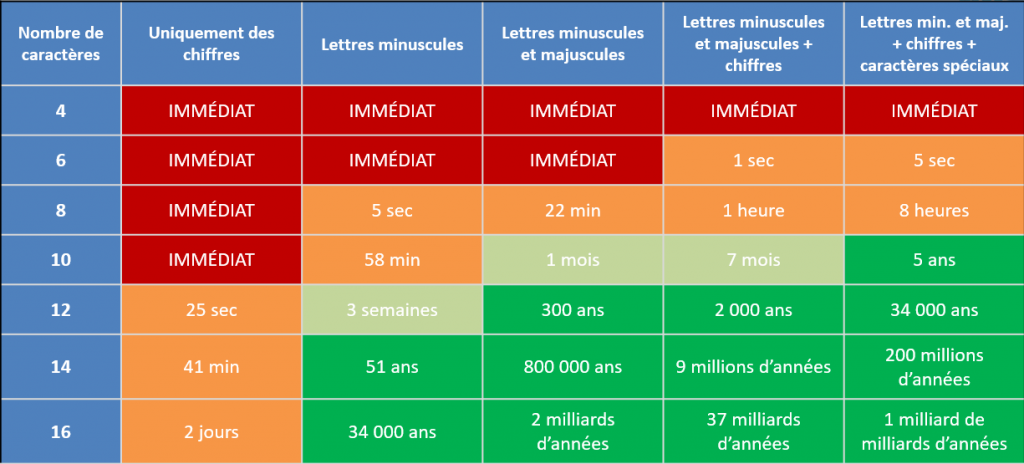 Le tableau ci-dessous illustre le temps nécessaire pour pirater votre mot de passe selon sa longueur et sa complexité :