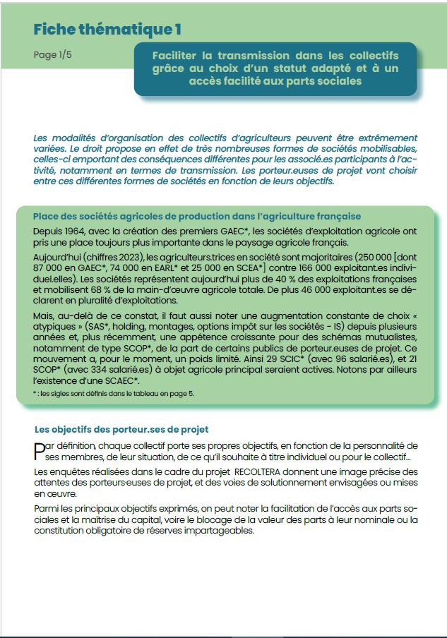 Cette fiche a été rédigée dans le cadre du projet Recoltera, destinée à des accompagnateurs-trices comme base de réflexion dans le cadre d’une transmission au sein de collectifs. Elle aborde comment le choix d’un statut adapté et un accès facilité aux parts sociales facilite la transmission.