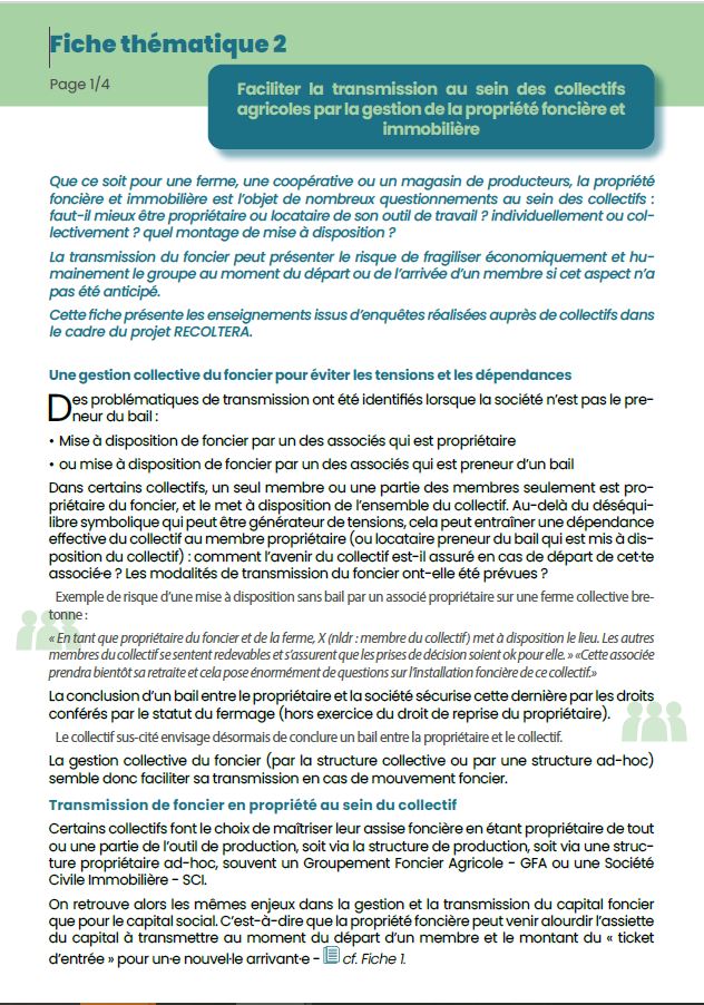 Cette fiche a été rédigée dans le cadre du projet Recoltera, destinée à des accompagnateurs-trices comme base de réflexion dans le cadre d’une transmission au sein de collectifs. Elle aborde comment la gestion de la propriété foncière et immobilière facilite la transmission des collectifs.