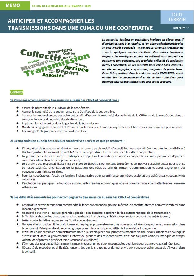 Mémo Anticiper et accompagner les transmissions dans une CUMA ou une Coopérative